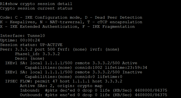 Il est à noter que GRE ne fait pas de cryptage, il encapsule juste la Data dans un Paquet avec un Header GRE. Si la protection des données est requise, IPSec doit être ajouté pour assurer la confidentialité et l’Intégrité des données.