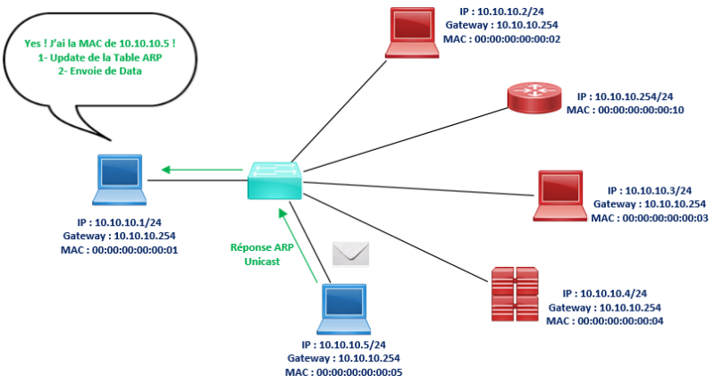 Une fois la réponse est reçue, la machine à l’origine de la requête ARP effectue une mise à jour de sa table ARP avec la MAC qu'elle a apprise et elle peut désormais envoyer le trafic DATA.