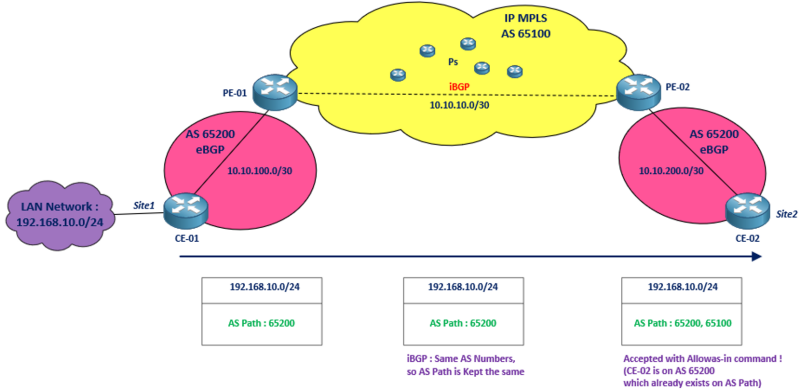 Cette commande s’applique au niveau du CE-02 dans l’exemple précédant, elle « contredit » la règle par défaut de « AS-Path split-horizon Rule » de BGP, et permet donc d’accepter les Networks provenant d’un AS similaire à son propre AS interne ..