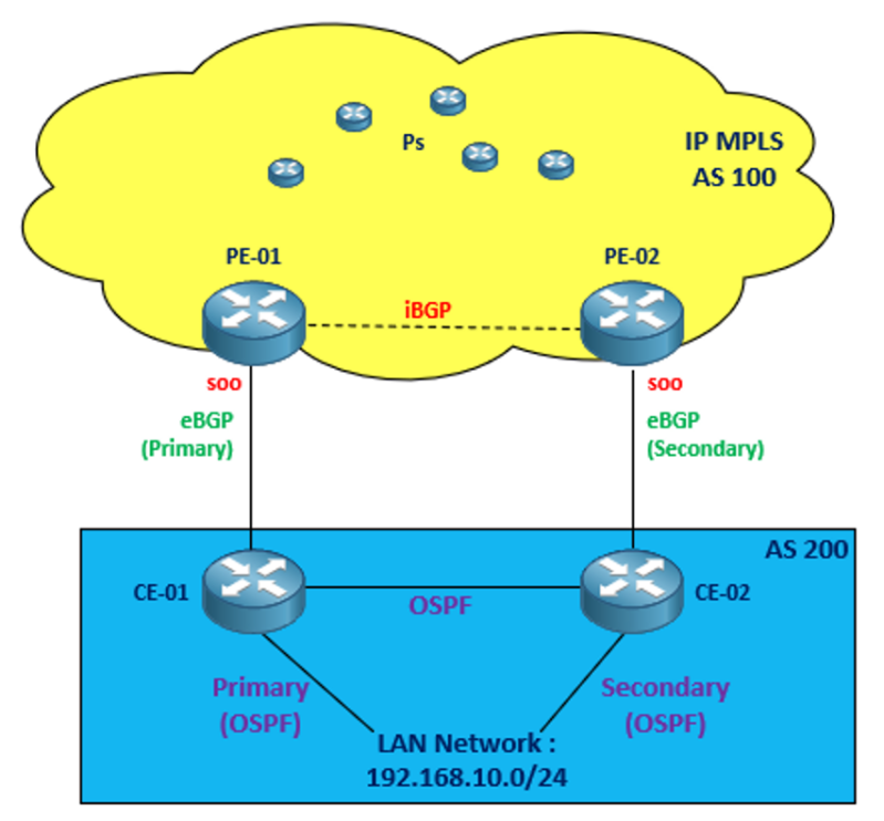 Lorsque PE1-01 reçoit le préfixe 192.168.10.0/24 de CE-01, il lui attribut le SoO configuré et l’envoie par suite à PE2 en Update BGP, ce dernier effectue une comparaison entre les deux valeurs de SoO qu’il trouve: celle qui correspond au voisinage PE-01/CE-01 (envoyée) et celle pour PE-02/CE-02 (actuelle configurée sur PE-02). Si les deux valeurs sont similaires, l’Update n’est pas transférée vers CE-02 et une boucle de routage est évité !