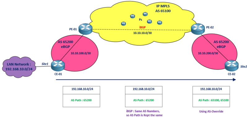 Vu la protection anti-boucle assurée par BGP quand un Site reçoit son propre AS dans l'AS Path (Block), le mécanisme ajouté manuellement d'AS-Override au niveau de PE permet de remplacer le numéro d’AS du client dans l’AS-PATH par son propre AS (Celui de l'opérateur).