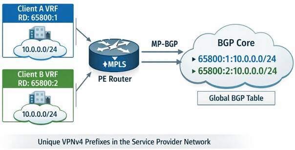 Ces deux préfixes sont alors uniques et peuvent coexister dans la table BGP globale du fournisseur de services sans conflit.